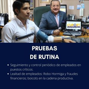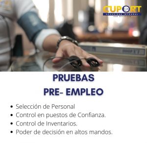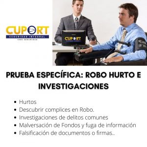Cuport Cía. Ltda., ofrecemos el servicio de pruebas poligráficas , esta consiste en un conjunto de preguntas que se realizan a una persona, a medida que responde, el polígrafo va registrando las variaciones de la presión arterial, el ritmo cardíaco, etc., señales que permiten determinar de una manera rápida y confiable si una persona miente o no y también para evidenciar un hecho específico (robo, hurto, etc.), permitiendo a las empresas y/o empleadores determinar el grado de confiabilidad de su personal existente o por contratar y de esta forma tomar decisiones más eficaces y basadas en dictámenes científicos y de gran exactitud.